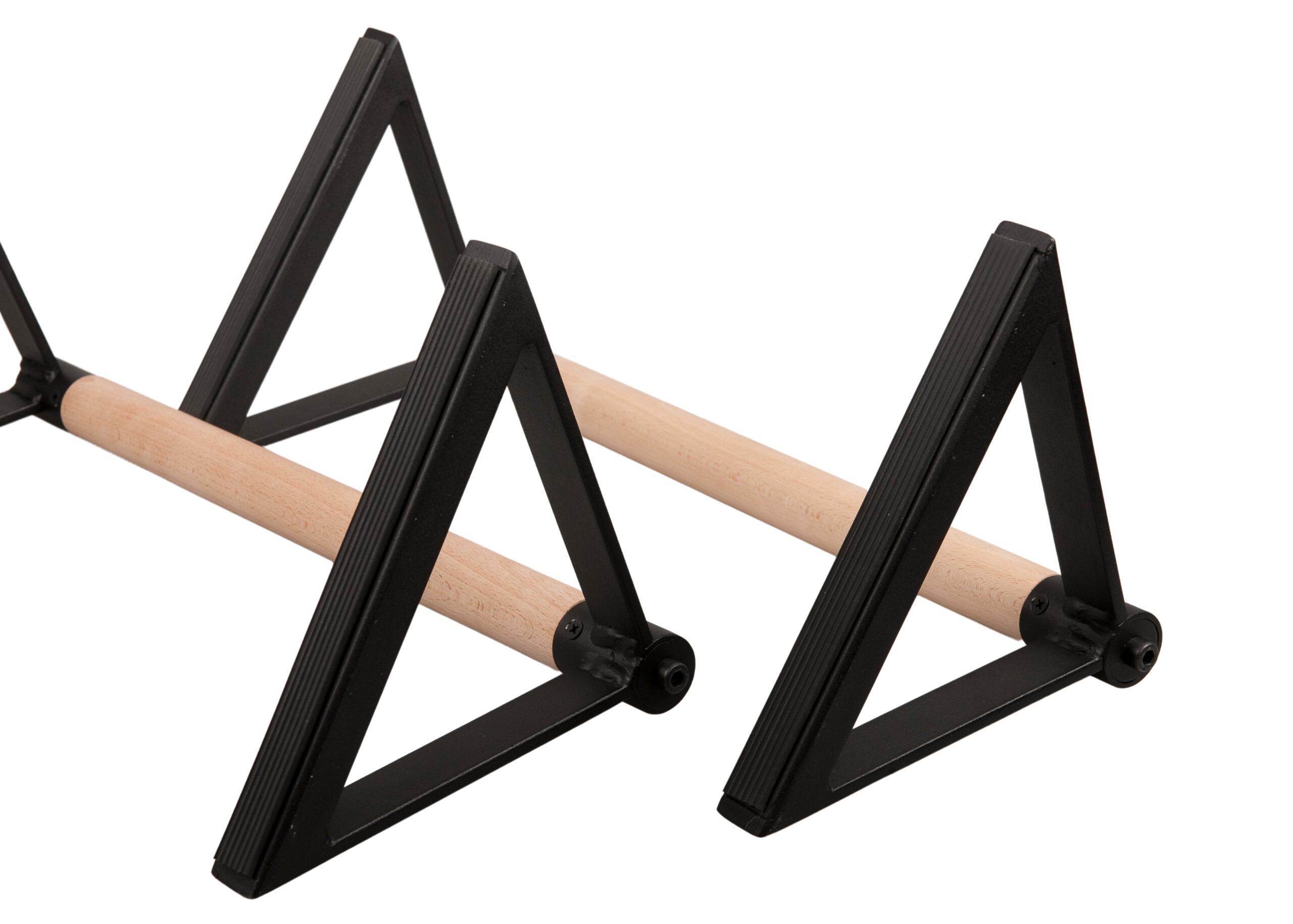 Drewniany uchwyt umożliwia komfortowy chwyt, a metalowe podnóżki zapewniają doskonałą stabilność. Dodatkowo paraletki od spodu posiadają gumowy pasek, który zabezpiecza przed ślizganiem się w czasie treningu, oraz chroni podłogę przed zarysowaniem.